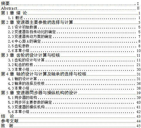 本次设计主要是通过查阅近几年来有关国内外变速器设计的文献资料,结合所学专业知识进行设计。通过比较不同方案和方法选取最佳方案进行设计,通过排量选择变速器中心距;各档传动比的计算;计算变速器的齿轮的结构参数并对其进行校核计算;计算选择轴与轴承,同时对其进行校核,对同步器、换挡操纵机构等结构件进行分析计算;另外,对现有传统变速器的结构进行改进、完善。