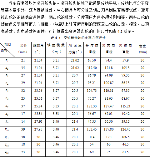 2、变速器齿轮设计计算。变速器齿轮几何尺寸计算;变速器齿轮的强度计算及材料选择;计算各轴的扭矩和转速;齿轮强度计算及检验;