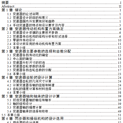 经过连续十四周的搜集材料、反复计算终于将本次毕业设计说明书初步定稿。再设计过程中主要完成了变速器传动方案的确定,变速器各挡传动比分配的确定,变速器齿轮参数的选择,变速器各挡齿轮齿数分配,变速器齿轮的设计计算,变速器轴和轴承的设计计算,同步器及箱体的设计,下面得任务是利用相关软件画装配图和零件图,在画图过程中完善说明书的内容,使其更加准确精密。