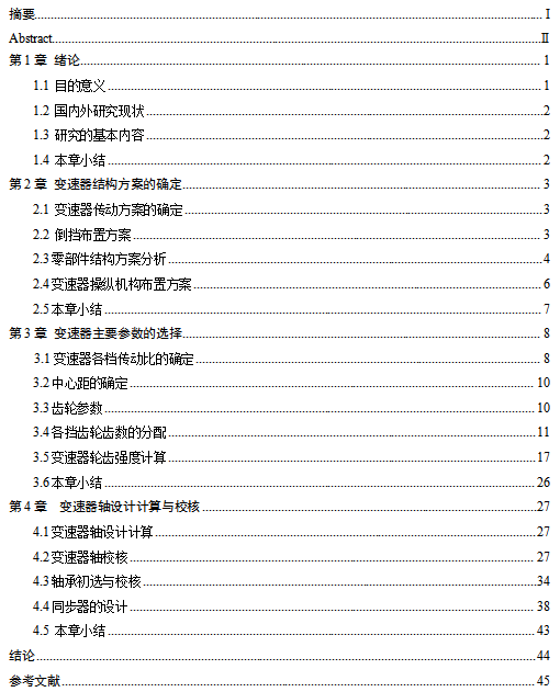 本设计的变速器是在北京现代变速器的参数基础上,在给定发动机输出转矩、转速及最高车速、主减速比等条件下,主要完成传动机构的设计,并绘制出变速器装配图及主要零件的零件图。