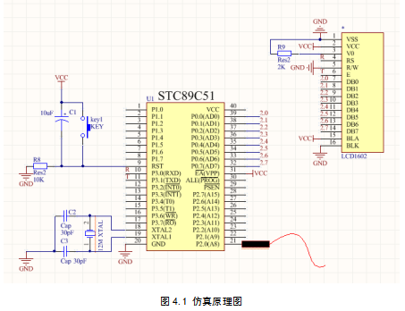 由于自身能力限制,目前对该系统只能做出理论上的分析,仿真只能就近似过程进行模拟。设计的仿真原理如图4.1所示,图中红色导线部分代表光纤,黑色矩形表示传感器的信号处理部分。由于所使用的仿真软件中没有光纤仿真器件,所以光纤传感器部分只能由其他测温器件代替。仿真系统由51单片机作为中央控制和信息处理单元,采用单总线技术连接4个DS18B20芯片。以此来模拟光纤测温传感器的测试仿真过程单片机传递指令给DS18B20芯片,DS18B20芯片测得温度信号后通过单总线传递给单片机,单片机根据得到的温度信息和DS18B20的地址信息确定总线分布位置的整体温度信息,并将所得信息显示在LCD1602液晶上。