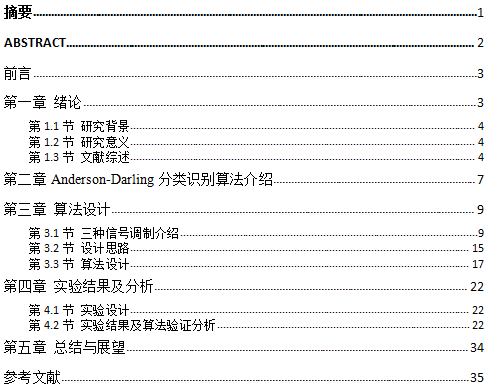 本论文所研究的内容主要为基于分布测试的数字信号识别,主要用到了拟合优度中 AD 检验方法。通过 MATLAB 进行计算仿真,根据仿真结果及相关统计数据对该算法性能进行讨论分析。
