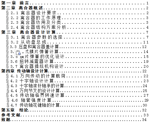 (1)通过熟悉离合器及操纵机构的结构和工作原理,初步选择合适的离合器和操纵机构,选择离合器的主要参数并优化;对膜片弹簧进行强度计算、基本参数选择、材料和制造工艺和优化设计;对扭转减震器进行刚度和转矩的计算;对操纵机构进行受力分析,设计合理机构;对离合器主要零部件的结构:从动盘总成、离合器盖总成、分离轴承总成进行结构和相关数据的计算。