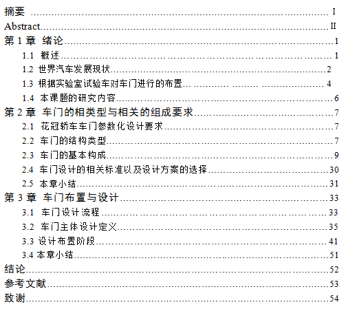 本课题研究是以花冠汽车开发项目为依托、以CAD为软件平台,在开发过程中从造型数据模型确立,到前车门各个机能件选型,结构布置,直到结构设计完成,并结合工艺、工装的设计验证,建立起一套完善的车门设计解决方案。
