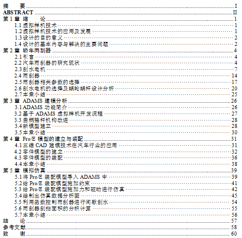 雨刮器总成含有电动机、减速器、四连杆机构、刮水臂心轴、刮水片总成等。本设计要求进行捷达轿车雨刮器部件尺寸的设计,求解刮扫面积等;要选择电机的型号,分析雨刮器的控制电路及间歇电路,分析电机的自动回位装置,确定雨刮器的硬件的尺寸等,求解雨刮器的刮扫面积,利用ADAMS软件进行运动分析,获得运动的轨迹和速度,并运用Pro/E绘出三维模型。