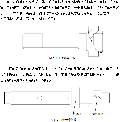 对于本次设计的变速箱来说,其特点是:扭矩变化范围大可以满足不同的工况要求,结构简单,易于生产、使用和维修,价格低廉,而且采用结合套挂挡,可以使变速器挂挡平稳,噪声降低,轮齿不易损坏。在设计中采用了三轴五档手动变速器,设计中通过计算,传动比依次是3.85,2.55,1.69,1.12(修正为1)。中心距为77.08,齿轮模数2.5.传动比分别是通过较大的变速器传动比变化范围,可以满足汽车在不同的工况下的要求,从而达到其经济性和动力性的要求;变速器挂档时用结合套,虽然增加了成本,但是使汽车变速器操纵舒适度增加,齿轮传动更平稳。