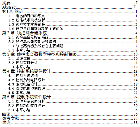 1.线控离合器的组成部分及其特性的研究,为控制系统的设计提供依据。从硬件方面讲,必须设计直流电机的驱动电路,完成闭环反馈控制;从软件角度讲,要获得精确控制,必须考虑复位弹簧引起的非线性。
