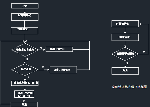 2. 汽车前照灯防眩目系统,因为单片机P3.7是信号的输出端。我们可以把P1.0和P3.4口路连接好后,把一个电位计连在P1.2口,另一个接在P1.3口,光敏电阻接P1.1,看电路连好后,如果电路板上的结果和设想的不同,由于在硬件检查部分已经确定了硬件没问题。则应该是软件部分即程序方面的问题。需要检查程序,首先检查P1.0口输出的方波频率有没有达到我们要的77KHz和P3.7口的输出300Hz的方波,因为前面已经确定硬件没有问题了,所以,在软件调试的时候可以结合硬件来在线调试,这样很直观,而且发现问题也很容易,这样我们就能达到我们的目的了。