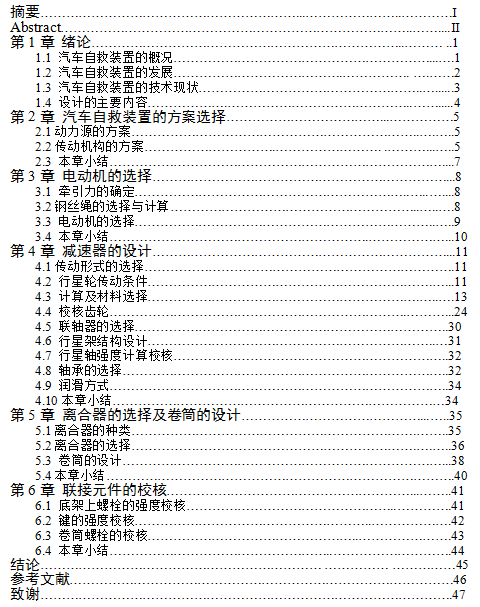汽车自救装置的设计是一个复杂的设计过程,其中包括对电动机的选择,联轴器的选择,行星齿轮减速器的设计和离合器的选择,钢丝绳的设计和计算校核。其设计成功与否直接影响汽车在危难时刻是否成功脱险。设计的基本内容:本设计将参考现有电动绞盘机的基本形状,并根据设计要求查找相关资料进行的设计,在选择汽车自救装置中的电动机后,根据汽车自重选择减速器,使之符合使用要求。最后进行汽车自救装置性能分析计算。在对各种结构件进行了分析计算后,运用CAD绘制汽车自救装置的整体图及主要部件的零件图。