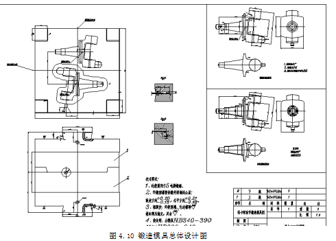 第四章完成了转向节的所有模具的设计,包括锻造的工步的确定,轴部摔模,劈料胎膜,压垫的设计,模具压力中心的计算终锻锻造模具的设计钳口的设计预锻型槽跟终锻型槽的设计,锻造模具的总体设计图,还有切边模具切边凹模的设计。
