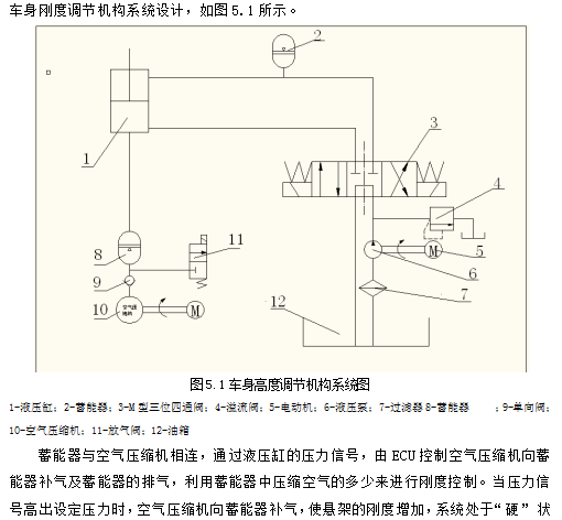 2:通过液压系统的深入了解,结合主动悬架知识,设计了电子控制液压传动的可以自动调节车身高度,悬架阻尼,悬架刚度的液压系统机构。