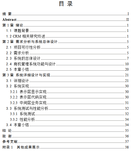 正文本文分为三章,其中第一章为序论,第二章为需求分析与系统的总体设计,并单独对商机管理模块进行具体说明。第三章为系统详细设计与实现,并包括了系统测试与性能分析。