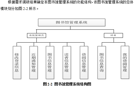 本系统采用了Browser/Server体系结构,JSP(Java Server Page)作为前台开发工具,MySQL作为后台数据库进行开发。本系统需要有两种管理人员,一种是系统管理员,一种是读者,系统管理员能够管理要想读者们通知的信息、读者的信息 、所有图书的信息以及读者借阅的信息,而读者则可以在登录系统后查询图书信息,修改借阅信息,和修改本人的信息。在实现这些功能的同时,还对本图书馆管理系统的操作界面进行了很好的设计,极力为用户提供一个友好的操作环境。我们主要从以下的三方面着手:可交互性、信息显示以及数据的输入。本课题采用B/S模式,面向图书馆而开发的图书馆管理系统,登录时需要对身份进行验证,登录以后每个权限用户只能使用自己权限范围内的功能,其各角色功能如下:
