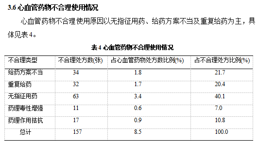 结论 我院门诊心血管药物使用率较高,门诊处方存在诸多不合理情况,主要包括用药方案不当、重复给药、药理毒性增强及药理作用拮抗。应该进一步加强心血管药物的合理应用,提高我院临床用药的安全性、有效性、经济性。