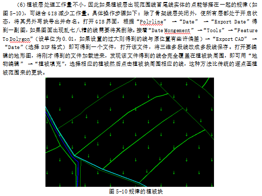 (6)植被层处理工作量不小,因此如果植被层出现范围线首尾线实体的点能够搭在一起的规律(如图5-10),可结合GIS减少工作量。具体操作步骤如下:除了骨架线层关闭外,使所有层都处于开启状态,将其另外写块导出并命名。打开GIS界面,根据“Polyline” →“Date” →“Export Date”得到一副图,如果图面出现乱七八糟的线需要将其删除。接着“Date Mongement” →“Tools” →“Feature To Dolygon”(设单位为0.01,如果设置的过大则得到的线与原位置有些许偏差)→“Export CAD” →“Date”(选择DXF格式)即可得到一个文件,打开该文件,将三维多段线改成多段线保存。打开要编辑的地形图,将刚才得到的文件加载进来,发现该文件得到的线会完全覆盖在植被块周围,即可用“地物编辑” →“植被填充”,选择相应的植被然后点击植被块周围相应的线,这种方法比传统的逐点画植被范围来的更块。
